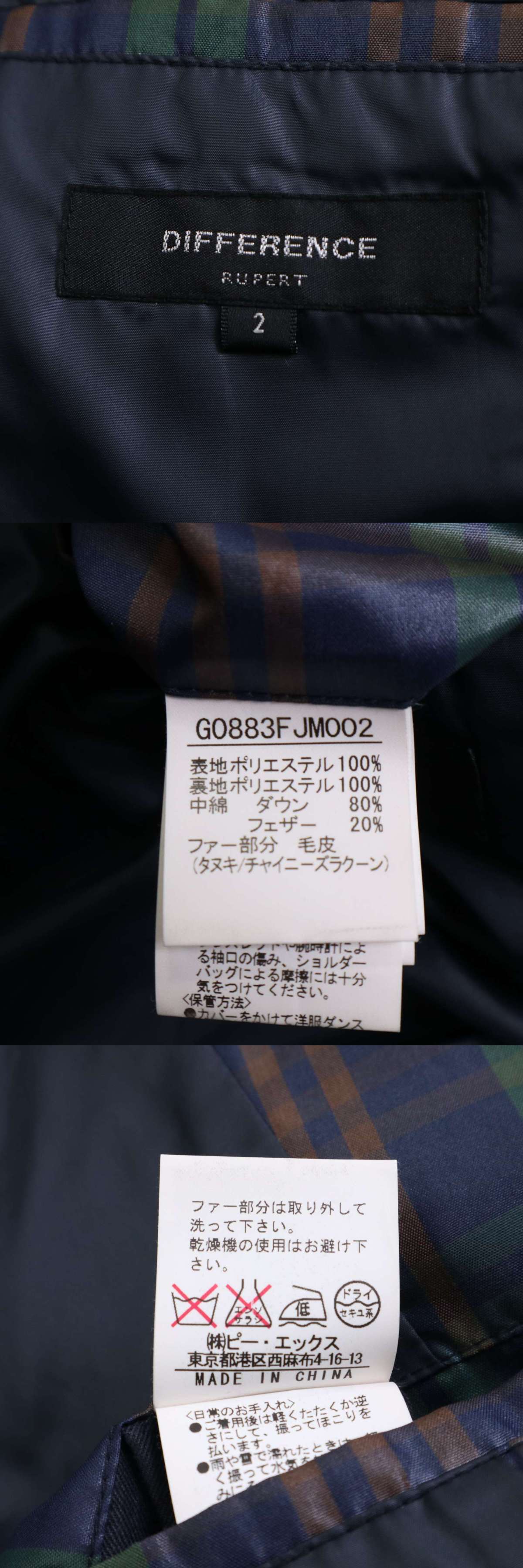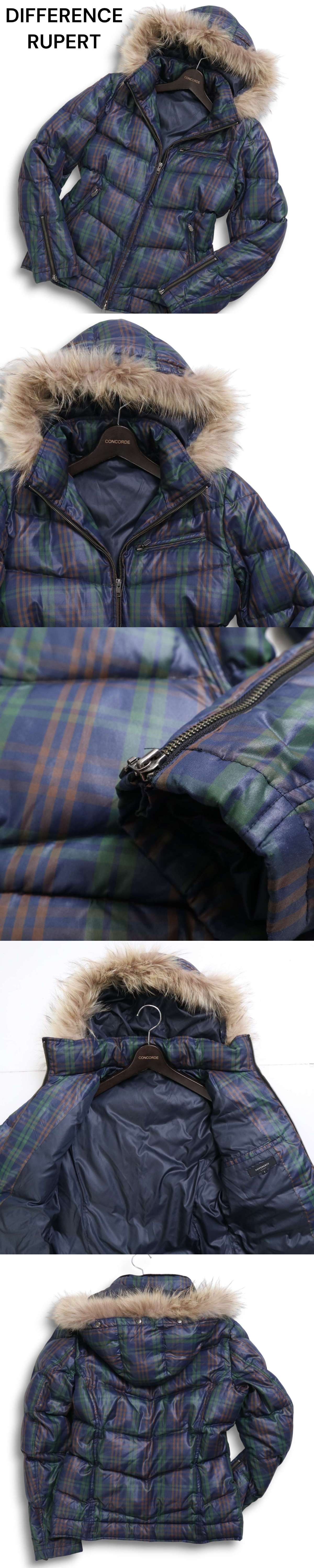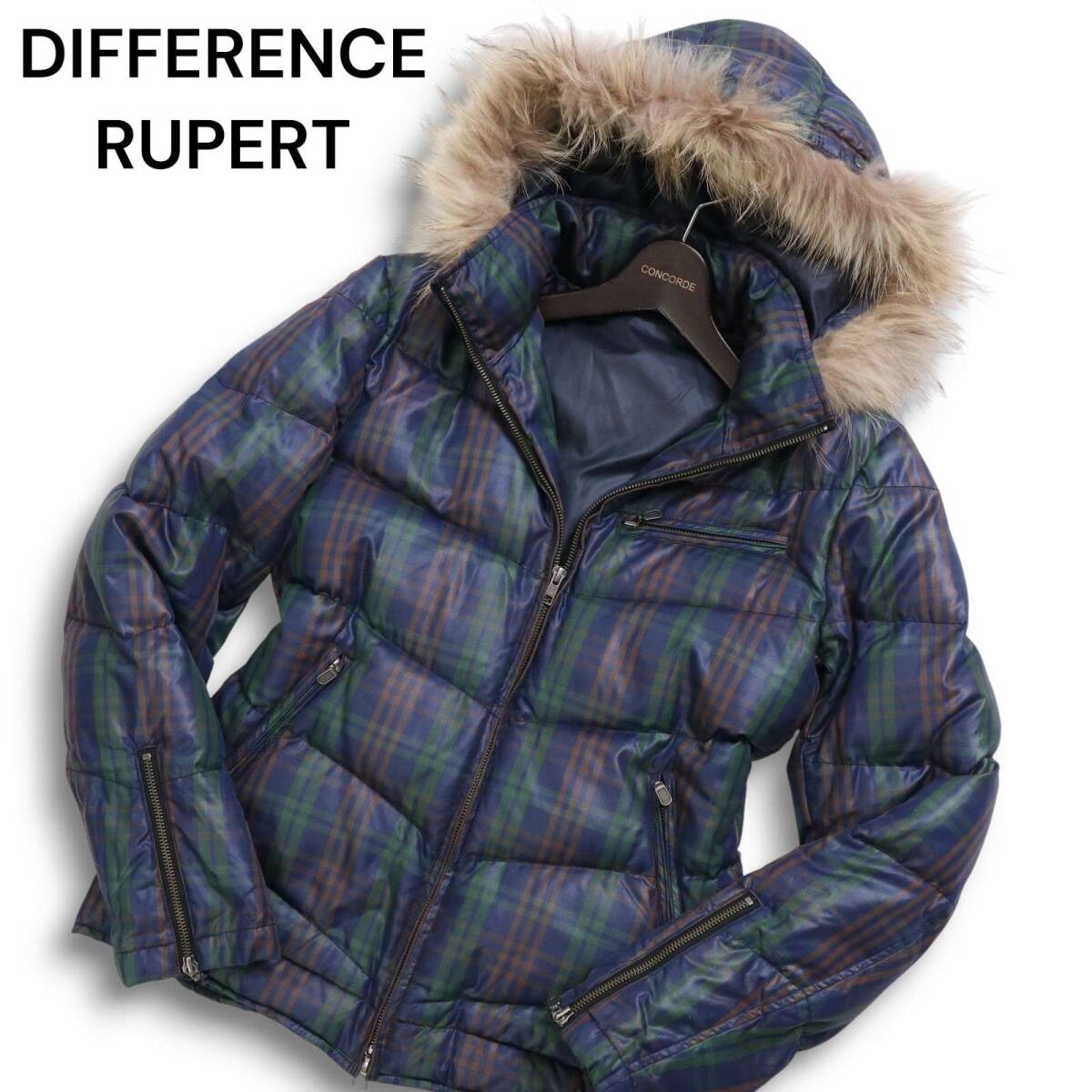 > Y2K 00s★ DIFFERENCE RUPERT ルパート 秋冬 リアル ファー★ 微光沢 タータンチェック ダウン ジャケット Sz.2 メンズ 紺