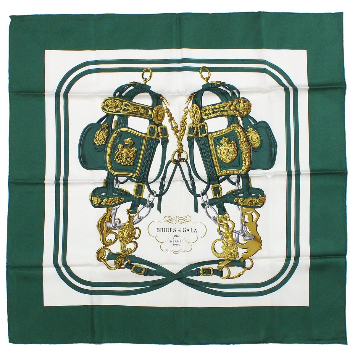 ★R2378 美品 エルメス カレ90 シルクスカーフ ブリッド・ドゥ・ガラ BRIDES DE GALA グリーン×ホワイト HERMES レディース メンズ★