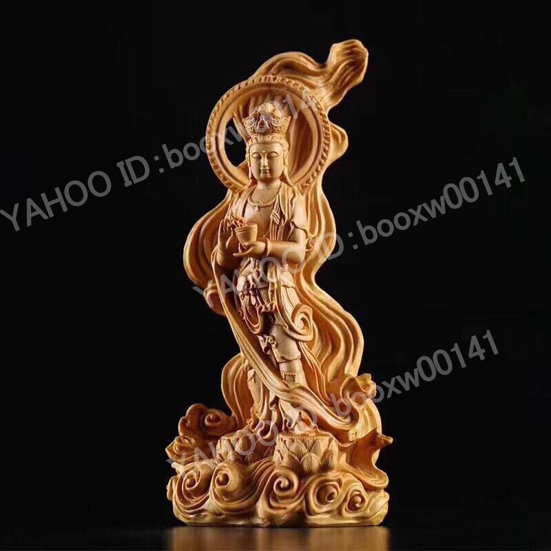 - 観音像 観音菩薩 立像 木彫り 仏像 置物 仏壇 茶碗 後光 透かし背景 数珠 高級天然 崖柏 透かし彫り 唐草光背 祈る 開運 風水 金運 hhw0048