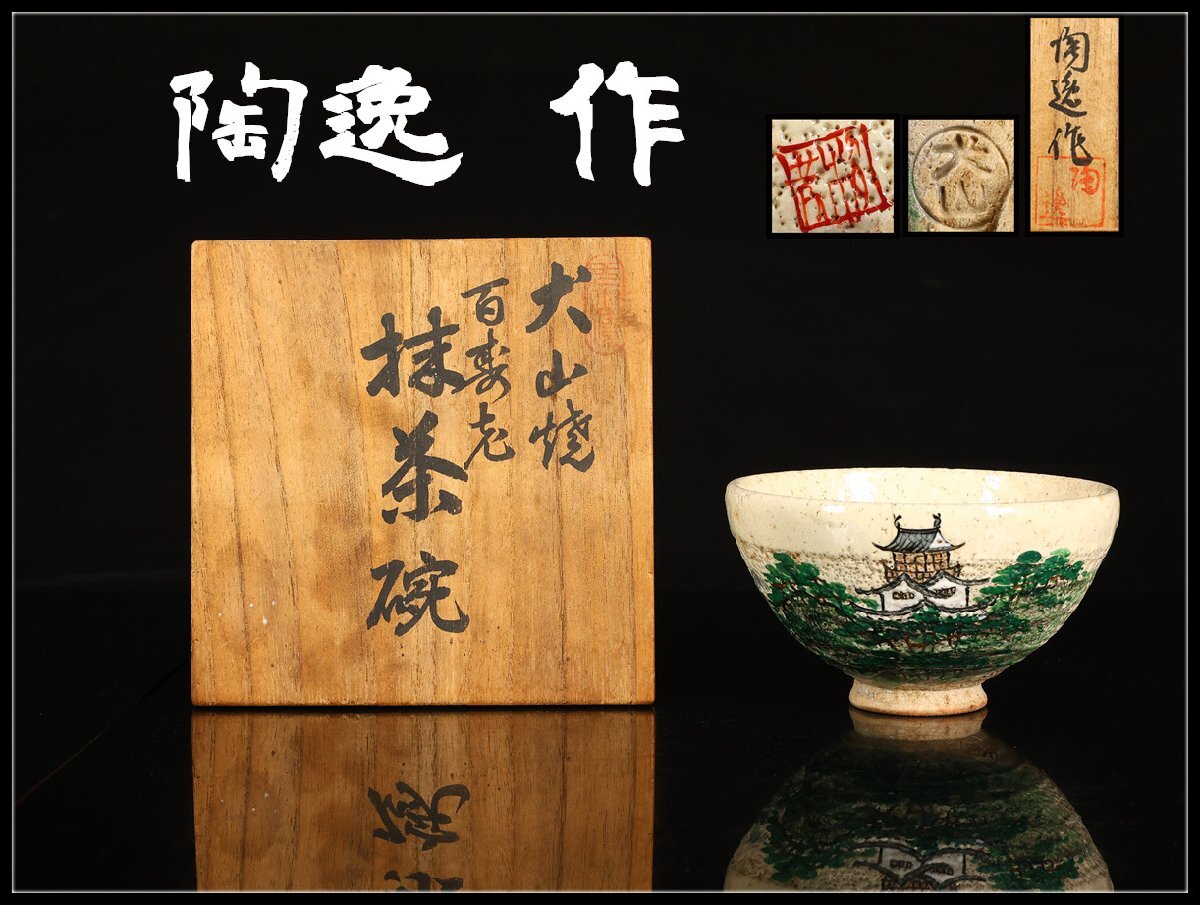 【吉】CN407 時代 犬山焼 【陶逸 作】 山水楼閣文 茶碗/共箱付!