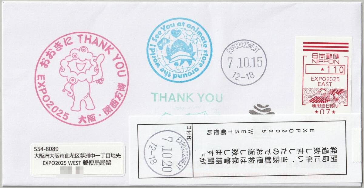 - 2025年 日本国際博覧会(2025大阪・関西万博)を記録するカバー/【閉幕日】10月13日 EXPO2025 WEST郵便局に発送 15日着印・10月20日付箋返却