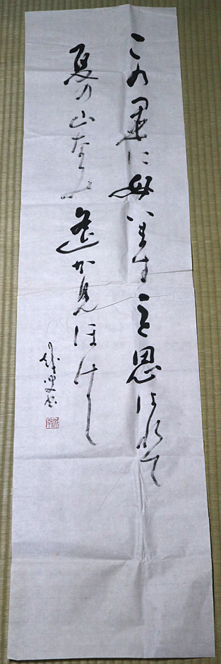 - sgk67)「真作」書家 中野越南 書 未表装 捲り「和歌 この〇に母の・・・」紙本 墨書 ●約139×35cm●古谷蒼韻の師<日本 書家 書道 額 掛軸