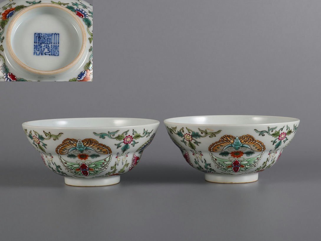 - ▼渡鶴羽▼A0720清道光 粉彩蝶恋花紋折腰碗一対・古陶磁器 ・珍品旧蔵・古賞物・時代物