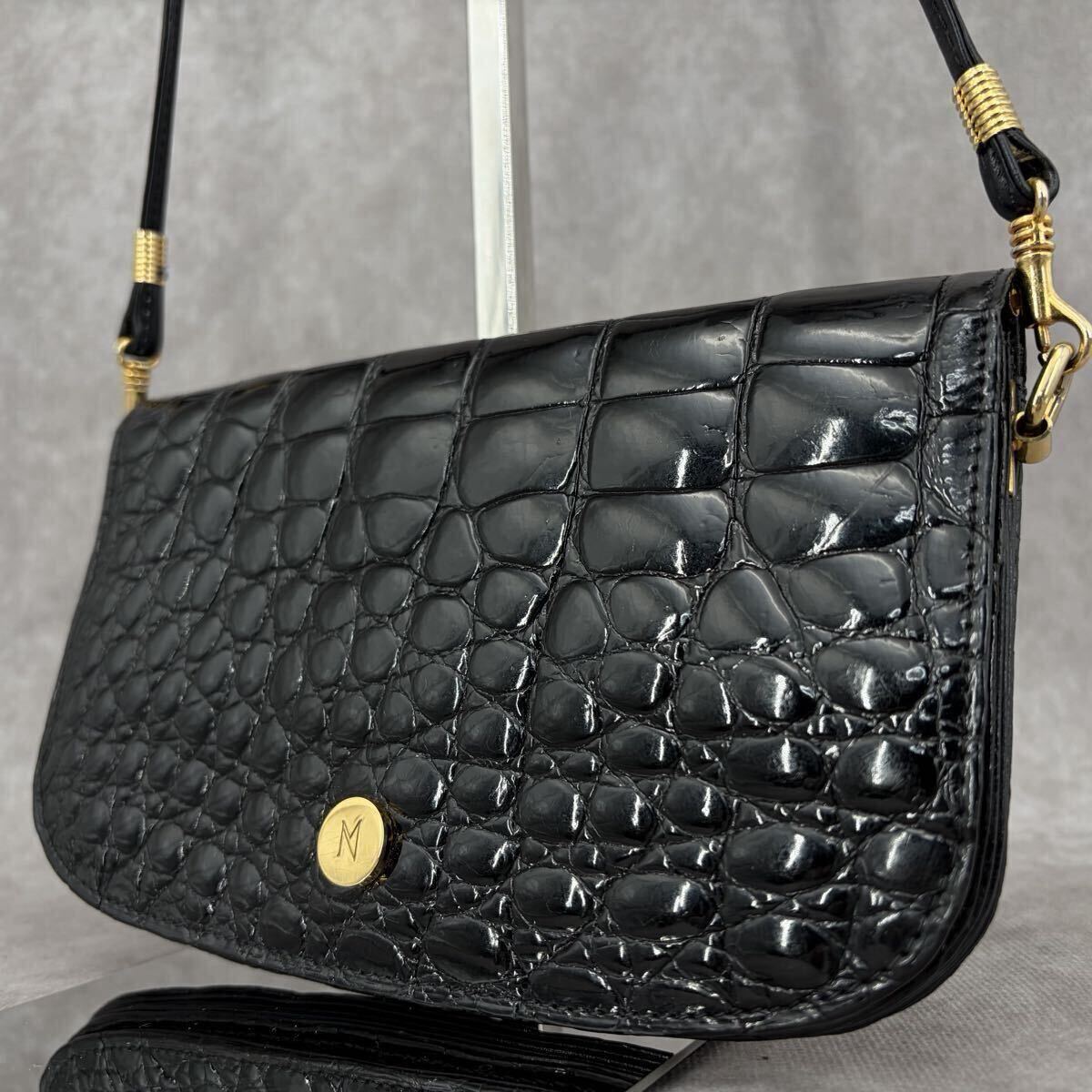 - 1円【良品/高級/リアル】NICO MARTELLI ニコマルテリ クロコダイル ショルダーバッグ ウォレット シャイニング ゴールド金具 ワニ革 レザー