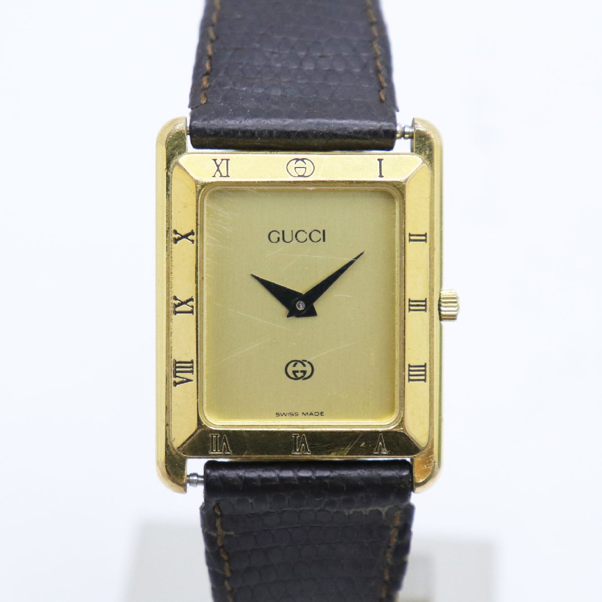 - 1円~ GUCCI グッチ 4200M ゴールド文字盤 クォーツ スクエア レザーバンド レディース メンズ ユニセックス 腕時計 稼働 中古 送料無料