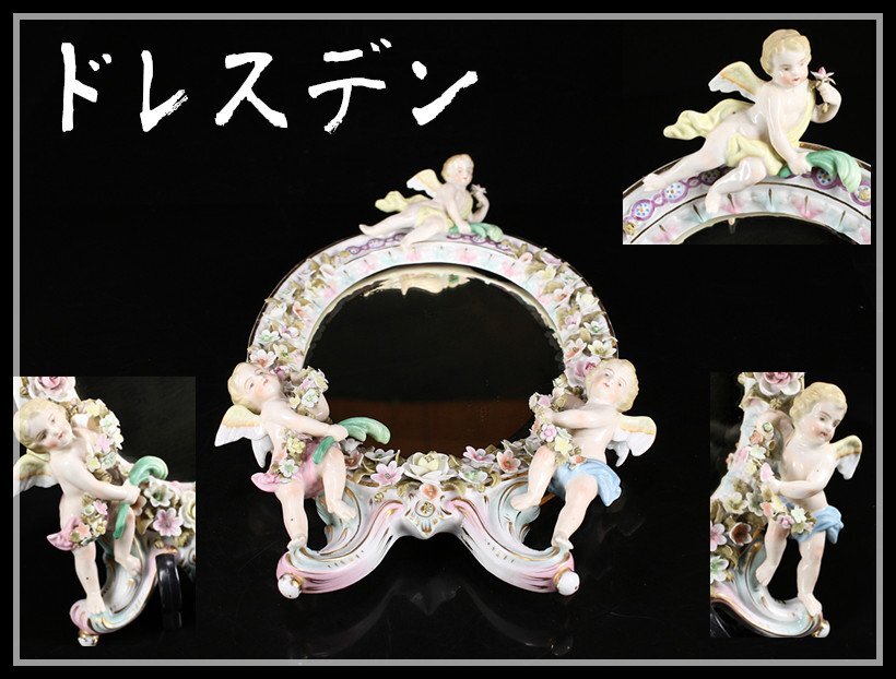 > 【吉】CJ777 十八世紀 初期マイセン DRESDEN 【ドレスデン】 色絵天使 鏡 壁掛 幅32×21㎝/美品!