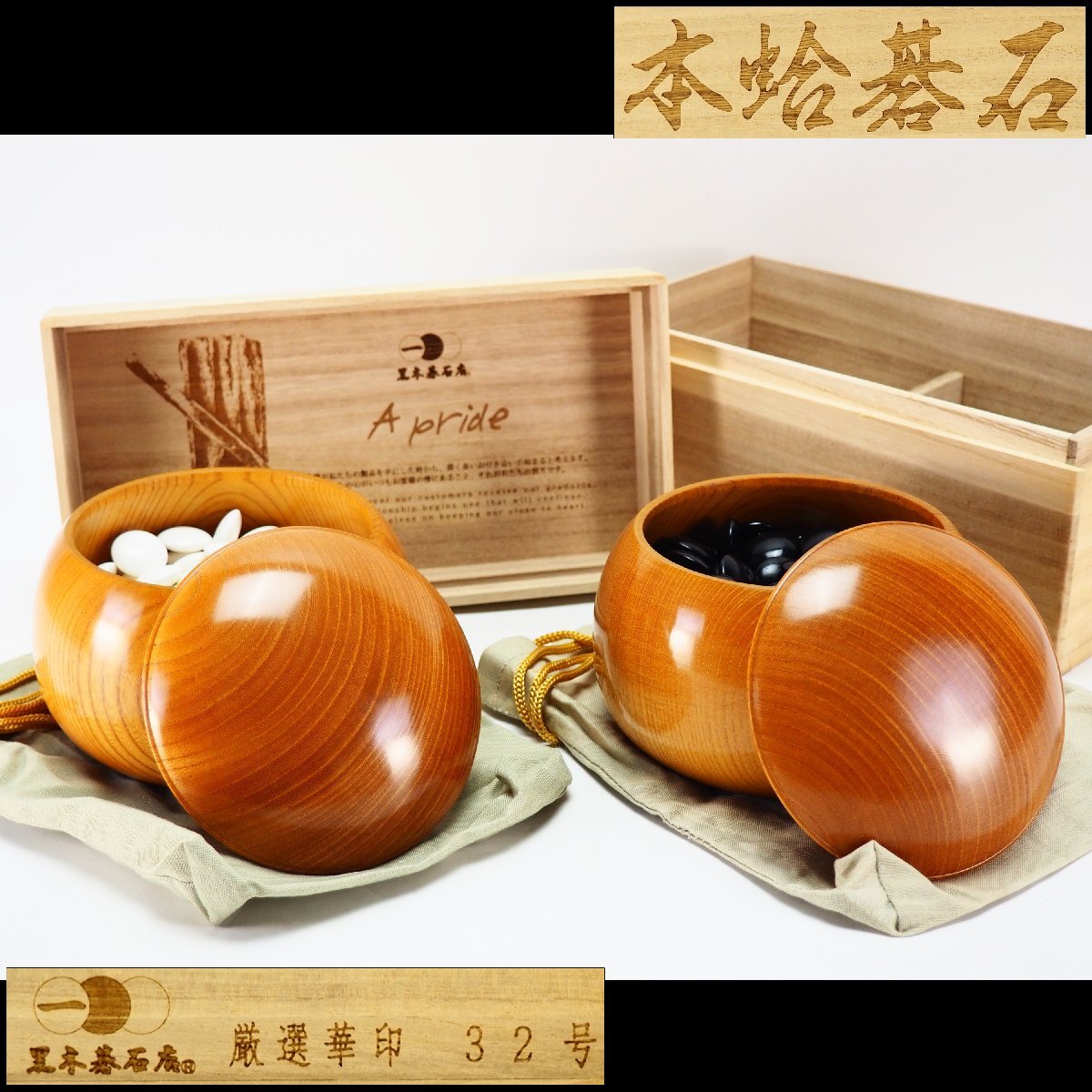 - 【治】黒木碁石店 囲碁道具 欅製刳貫碁笥付 本蛤碁石一式☆共箱 32号(白碁石180個)厚0.9cm(黒碁石180個)厚0.9cm 碁石 CQ04