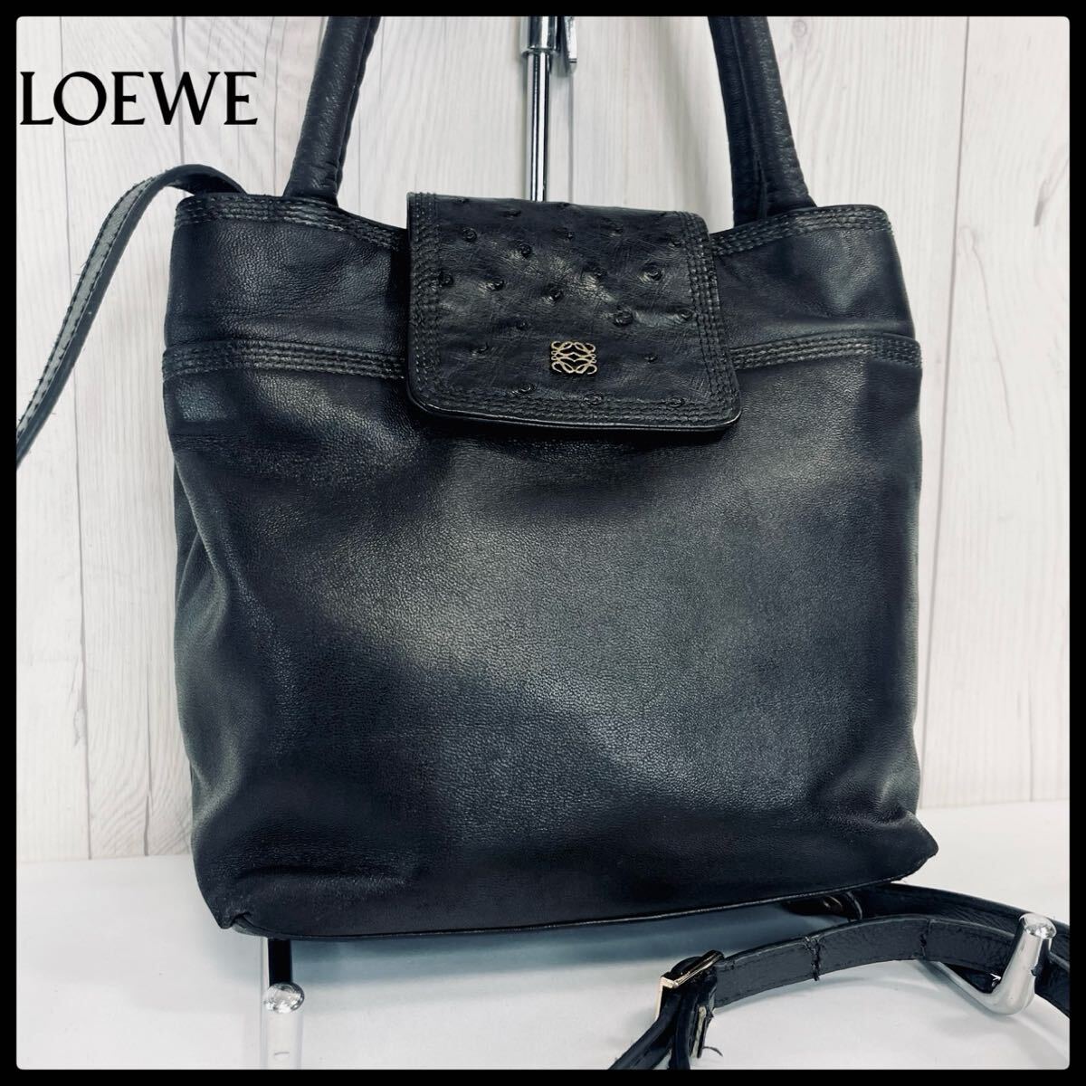 - ◆ 美品 ◆ ロエベ LOEWE アナグラム ショルダーバッグ オーストリッチ レザー ブラック 黒 ハンドバッグ バッグ カバン
