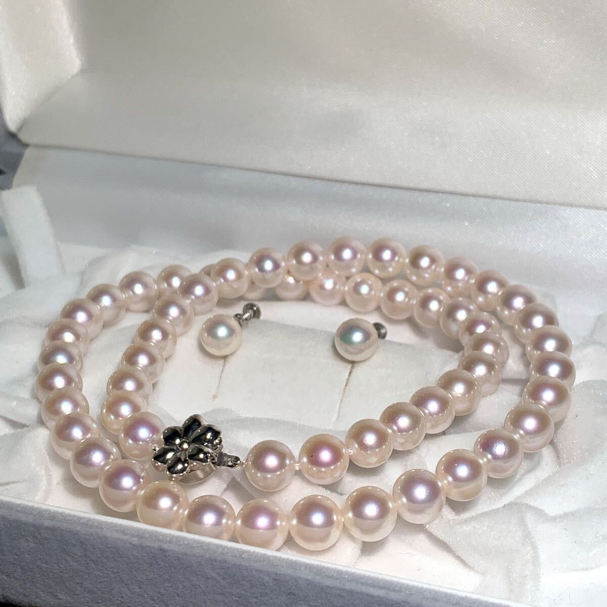 - 花珠真珠/K14WG 真総研 アコヤ あこや パール ネックレス イヤリング 本真珠 照り最強 ピンク 約7mm-7.5mm 約43cm 約33.5g 14金