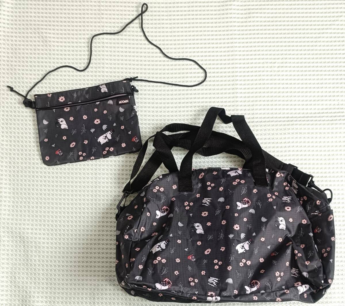 - MOOMIN ムーミン 2点 セット まとめ売り 旅行 ボストンバッグ サコッシュ ショルダーバッグ 黒 総柄 8446