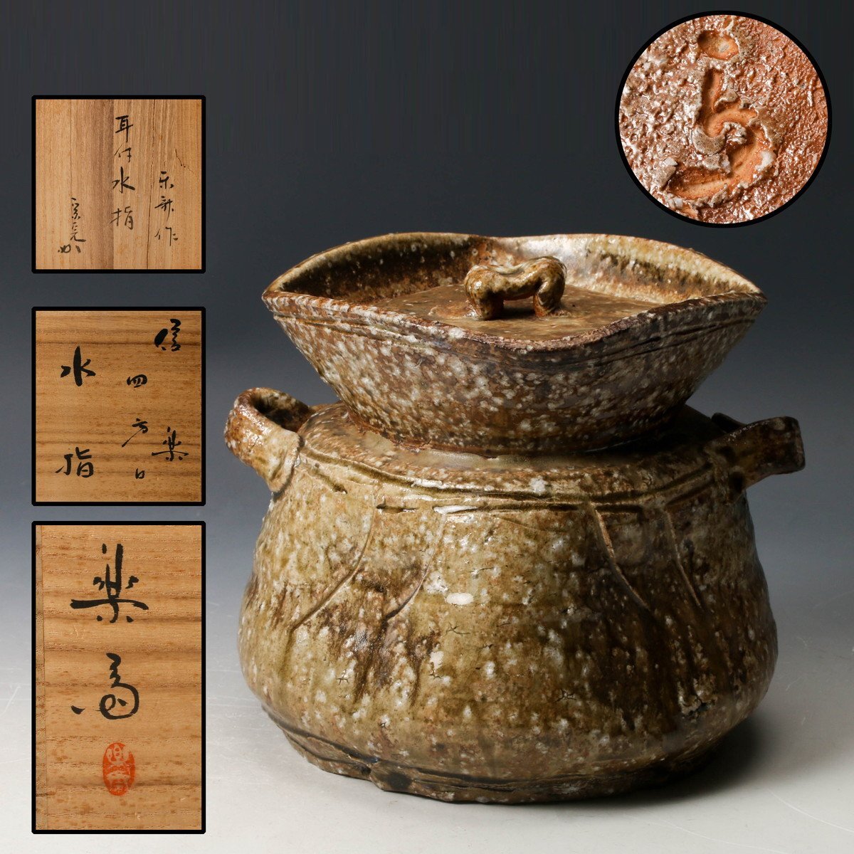 > 【佳香】高橋楽斎 信楽耳付四方口水指 表千家流長生庵堀内家十二代堀内宗完(兼中斎)書付箱 共布 茶道具 本物保証