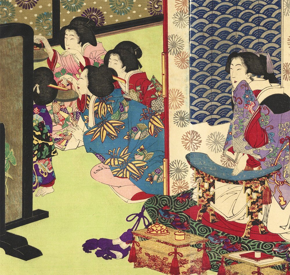 - 月岡芳年 「新撰東錦絵 越田御殿酒宴之図」 二枚続 本物 浮世絵 木版画 大判 錦絵 ukiyoe Toshitoshi Tsukioka 美人画