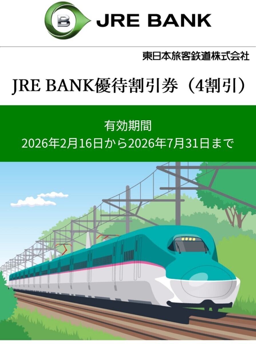 - JRE BANK 優待券 4割引 2026年7月31日まで有効 即日発行