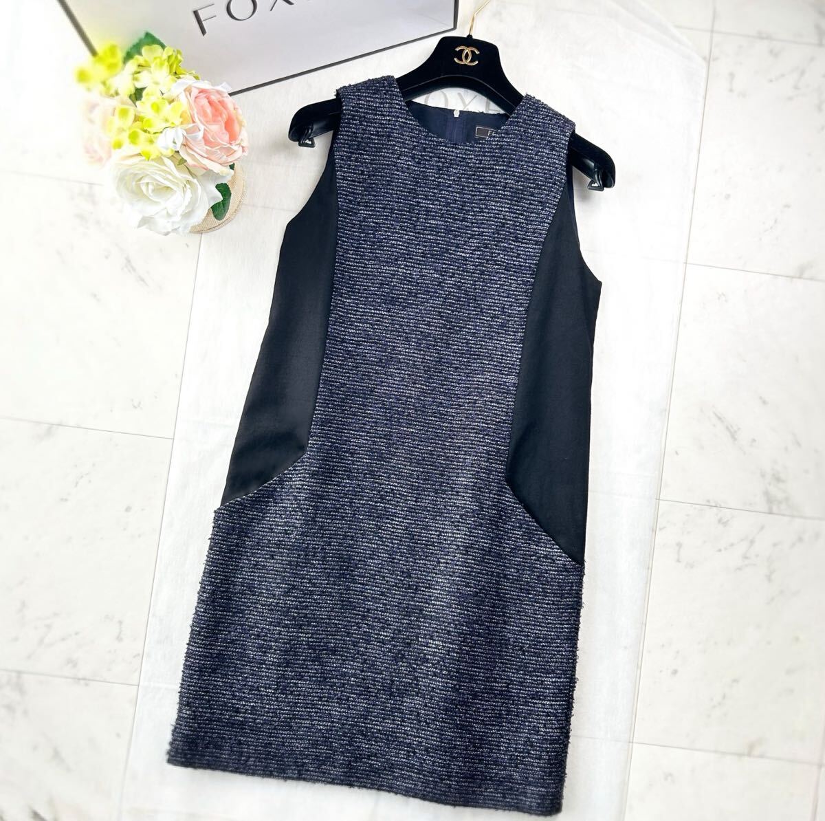 > 極美品 定価12万★FOXEY フォクシー★40★最高級ツイード 細く見えるサイドクールワンピース ネイビーブラック BLENDツイードドレス 完売XL