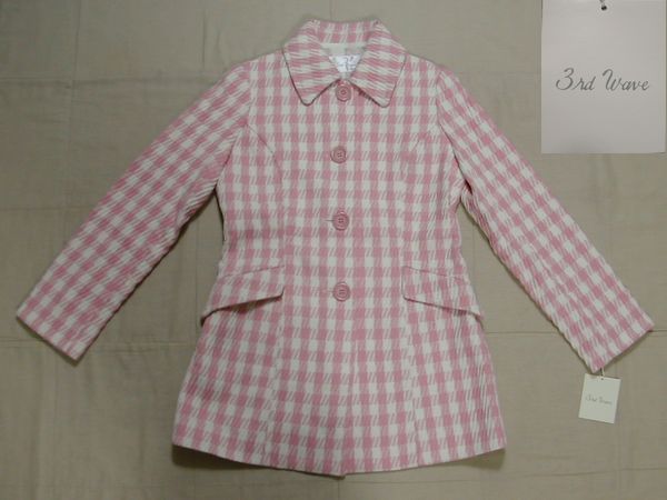 - ■タグ付新品:白とピンクのチェック柄ニットコート M DmT58