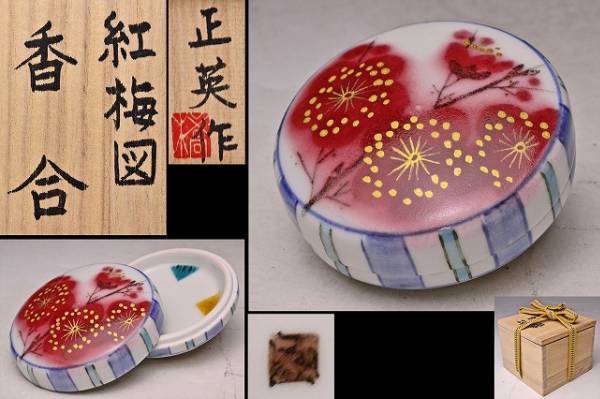 - 橋詰正英 ★ 色絵金彩紅梅図香合 ★ 共箱 ★ 検 人間国宝 藤本能道 茶道具