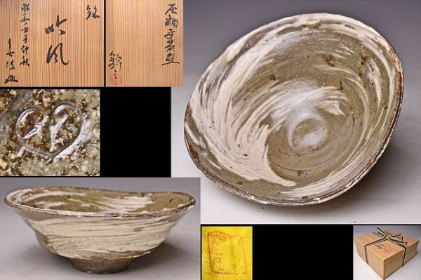 - 加藤錦三 ★ 灰釉茶碗 ★ 共箱書付箱 ★ 銘『吹風』 ★ 検 無形文化財 織部