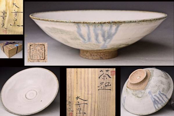 - 板東豊光 ★ 白釉青掛茶碗 ★ 共箱共布 ★ 大雪窯 ★ 検 板東陶光 結晶釉 ★ 北海道の陶芸家
