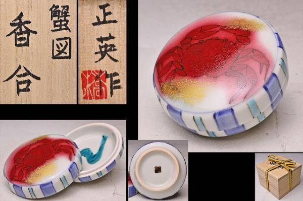 - 橋詰正英 ★ 色絵金彩蟹図香合 ★ 共箱 ★ 検 人間国宝 藤本能道 茶道具