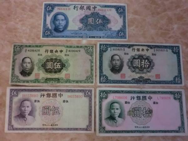 - ★ 中国銀行・中央銀行 伍圓・拾圓 5種5枚セット ★ No.500