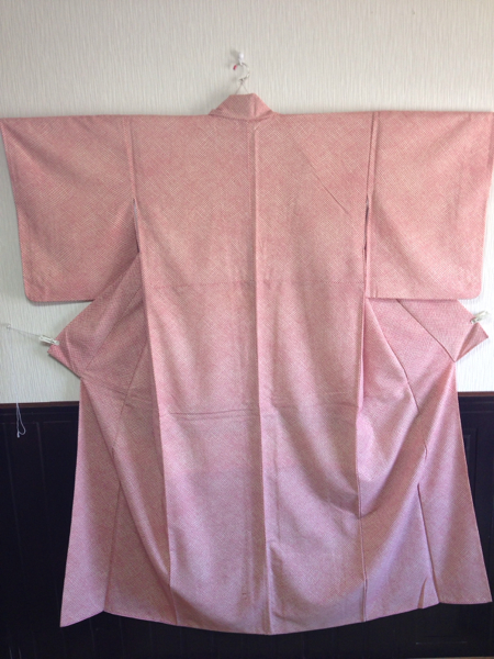 - 中古ウール袷着物 鹿の子柄小紋 赤 身丈154 リメイク 小物032107