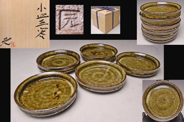 - 高鶴元 ★ 古上野釉小皿5客 ★ 共箱 ★ 灰釉タイプ ★ 検 高鶴大 高鶴淳 ★ 高鶴夏山 ★ 上野焼