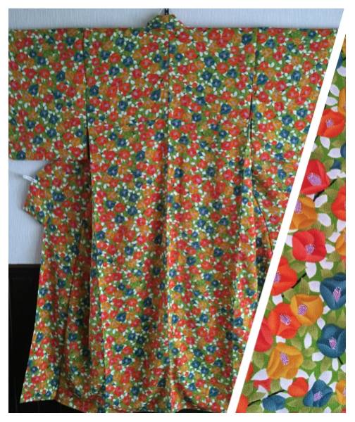 - 【小紋】正絹 袷 身丈149.5cm 縮緬 椿柄 躾有り 可愛い柄です