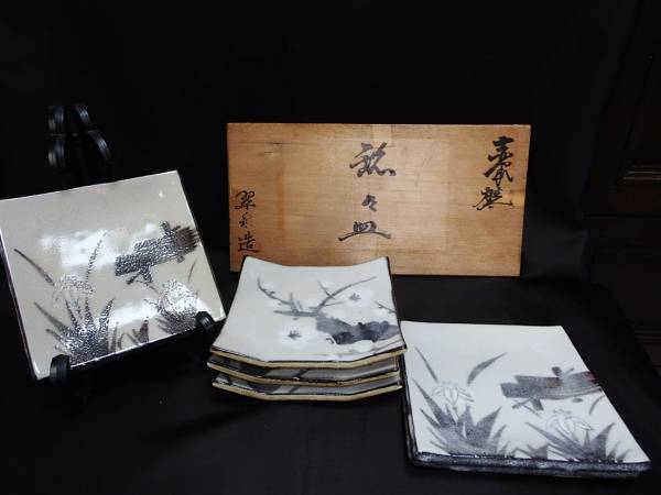 - 『 翠泉造 』 銘々皿( 3枚+3枚 )( 墨絵のような世界が・・・ )( 白梅としょうぶ )