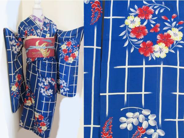 - ガーリーアンティーク!格子に花丸紋 絽アンティーク夏着物