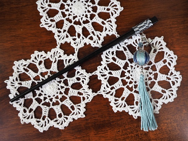 - 【ハンドメイド】手作りアクセサリー★スワロフスキービーズ巻き玉タッセル簪かんざし★水色青
