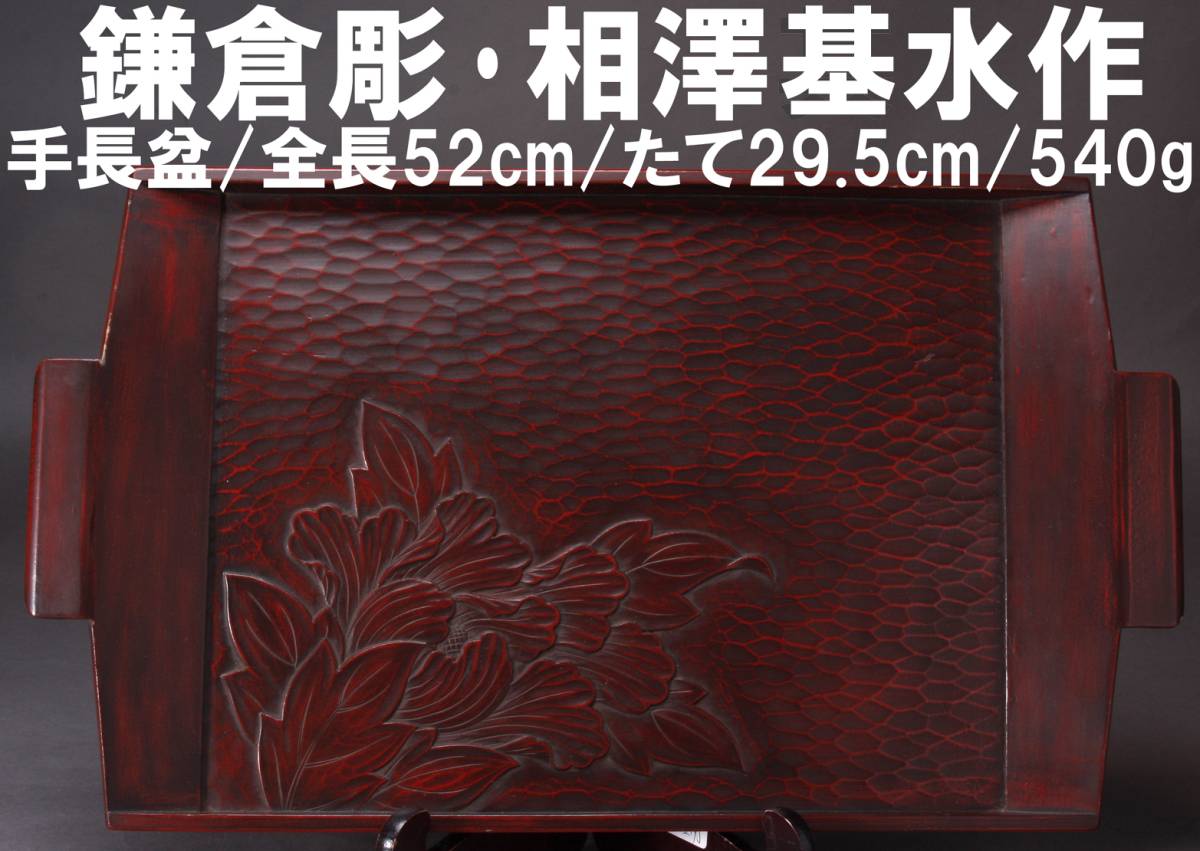 - 鎌倉彫 手長盆 相澤基水 木製 漆塗り 全長52㎝ たて29.5㎝ 540g 中古 KA-6776