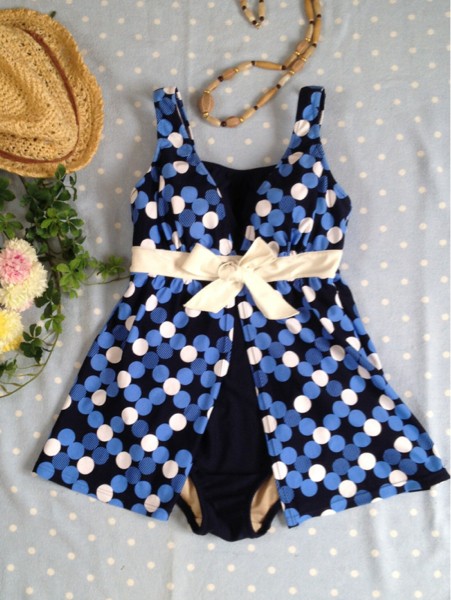 - ★紺色水玉模様と紺色無地の可愛い2枚仕立てワンピース水着★9M