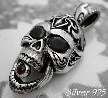- シルバー925銀の髑髏スカル レーザー ペンダント ガーネット眼/顎が可動します/Bu-boon silver