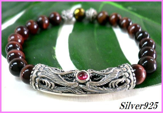 - シルバー925銀パーツ龍レッドジルコニア付×天然石8mmレッドタイガーアイ数珠ブレス/ラスト1点