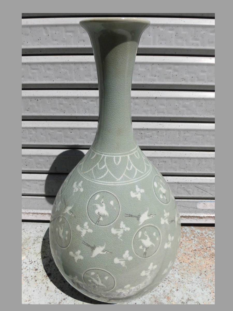 - no114 熊津窯 金一坤造 高麗青磁雲鶴花瓶 共箱