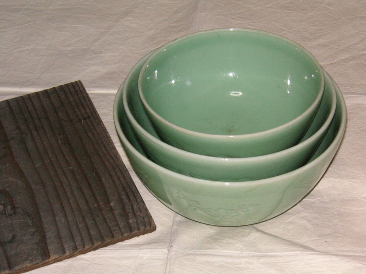 - 青磁 3鉢 共箱 江戸後期頃 雲龍 鳳凰