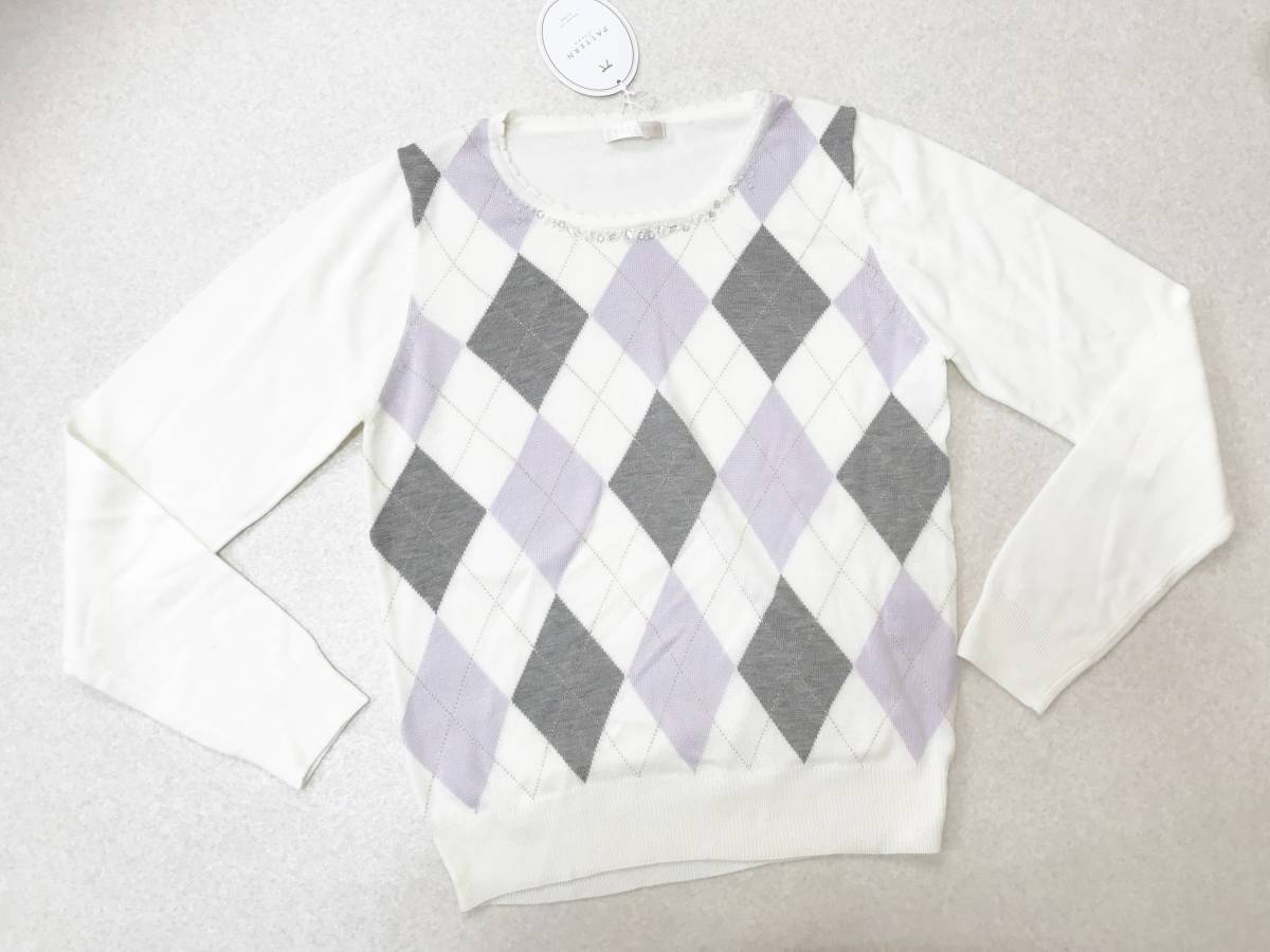 - パターン【PATTERN】胸元ビジューラインストーン・アーガイル・長袖ニット・セーター M