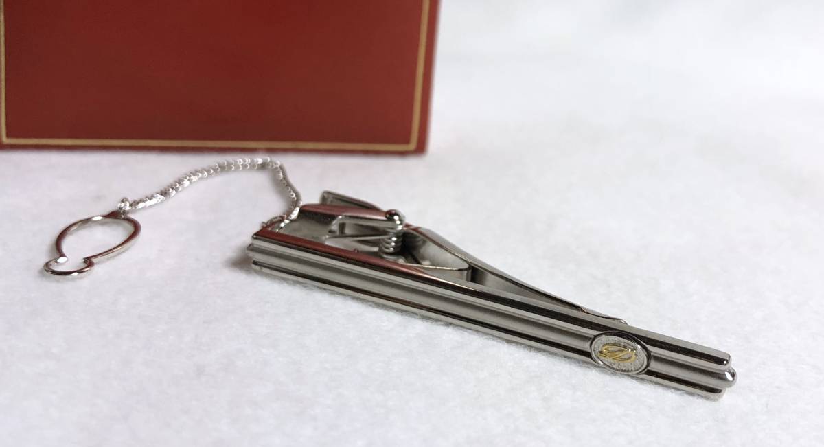 > 正規美品 激レア! S.T.Dupont デュポン Dロゴストライプラインネクタイピン シルバー×ゴールド タイピン タイバー 約5.7×0.4㎝ 付属有〇