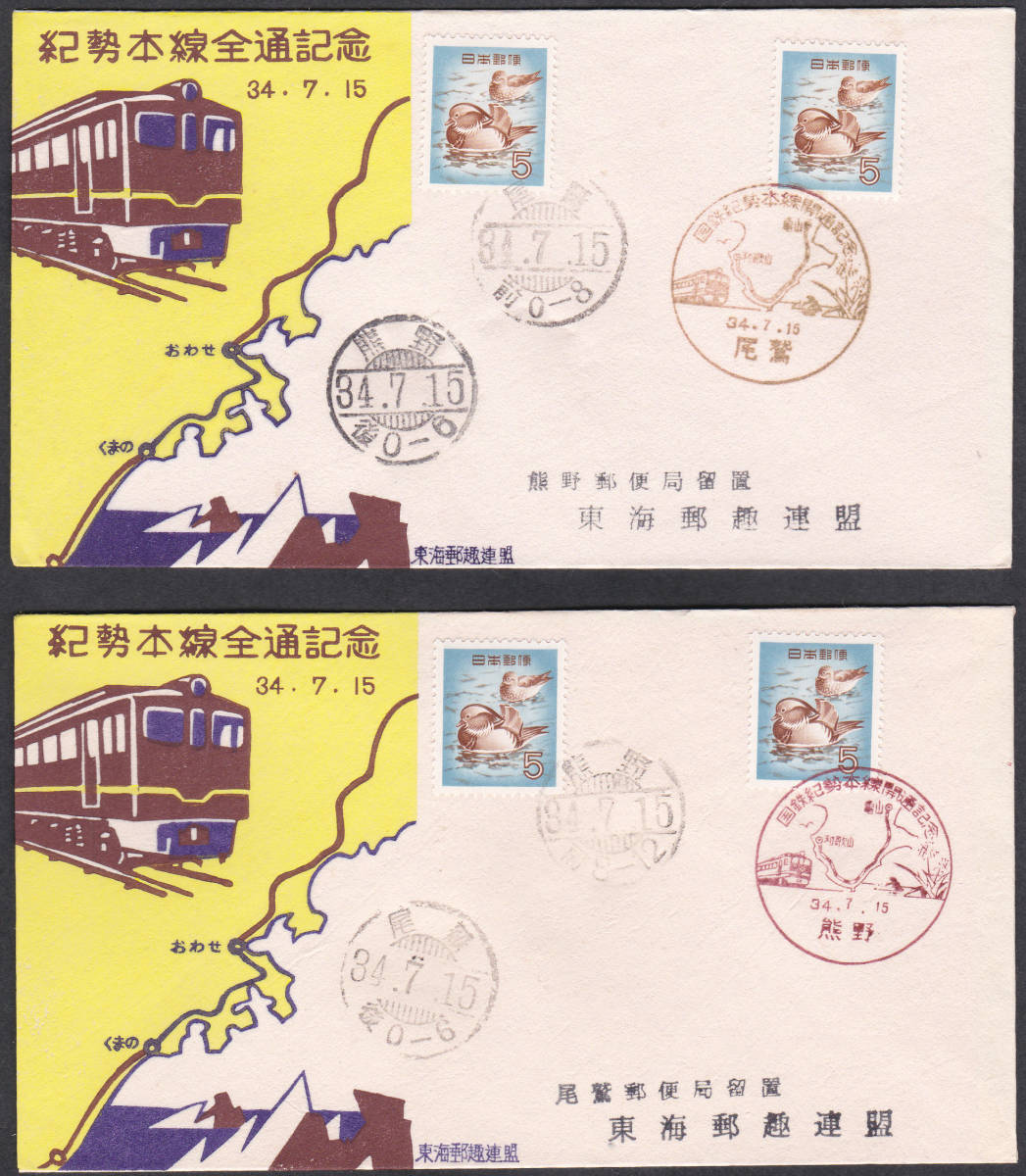 - 鉄道記念カバー 1959年 紀勢本線全通記念 熊野ー尾鷲 2通 東海郵趣連盟