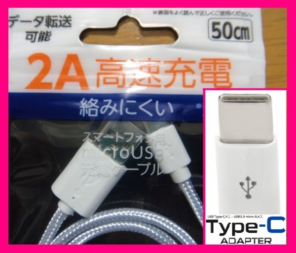 > 【送料無料】★USBケーブル と 変換 アダプター(タイプB⇒C変換):スマホ 充電 白 USB ★ マイクロ:充電ケーブル
