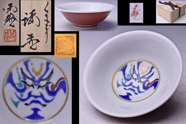> 山中國盛 ★ 色絵金彩くまどりぐい呑 ★ 共箱共布 ★ 酒器 ★ 歌舞伎 ★ 九谷焼 ★ 山中国盛