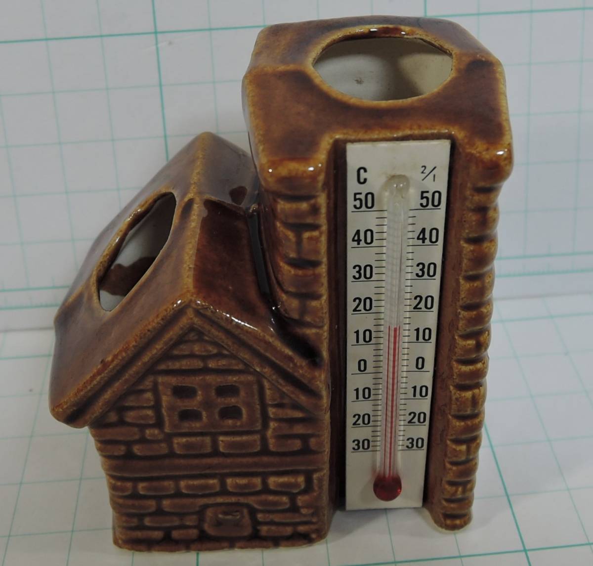 - L04昭和レトロ■温度計付 陶器製ペン立て■