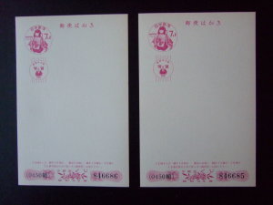 - 未使用・年賀葉書 4枚組【御所人形 7円+1円 二枚】1968年用 d+【万歳4円・ラグビー40円】1961.88年用