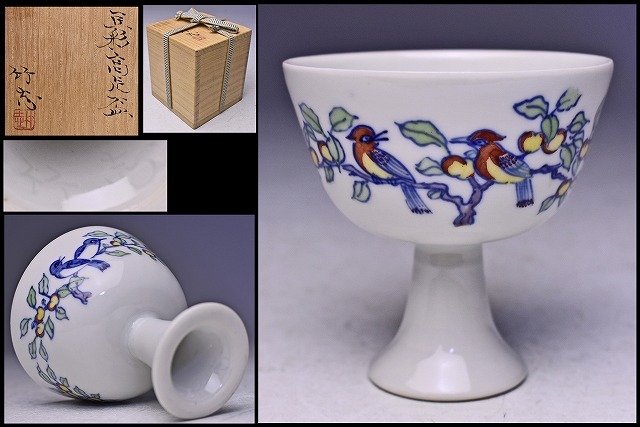 - 川瀬竹志 ★ 豆彩鳥文高足ぐい呑 ★ 共箱 ★ 酒器 ★京焼★小品ながら丁寧な絵付の見事な逸品★検 川瀬竹春 川瀬順一 川瀬忍 ★