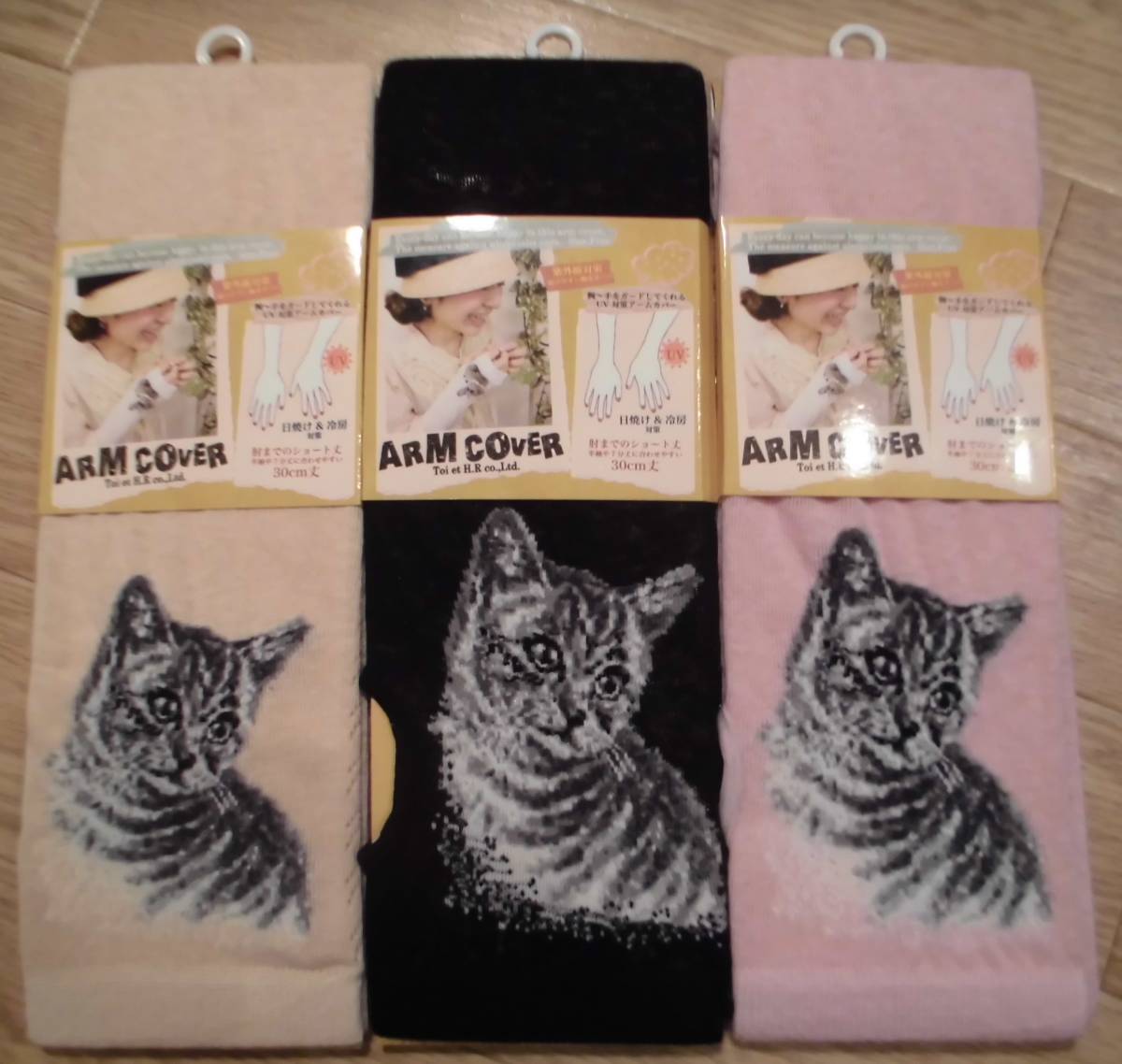 - 即決☆新品☆3色セットで!! 可愛い(^_-)-☆アームカバー レディース UV ネコ柄 三毛猫 ベージュ 黒 ピンク