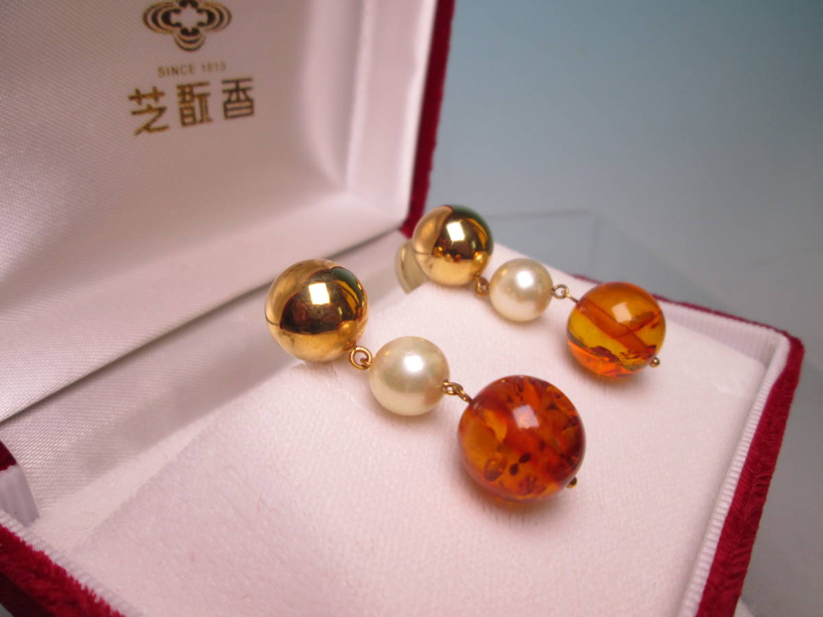- 【江月】芝翫香 K18 本真珠&天然琥珀の揺れるイヤリング 9,22g 共ケース付