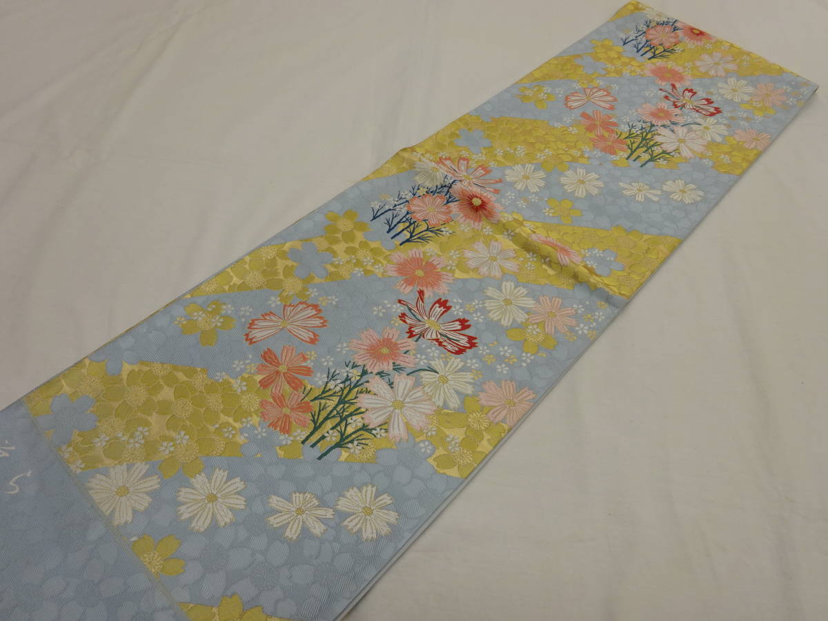 > 新品・未仕立て・振袖向き★京都西陣袋帯★薄水色地に花柄です