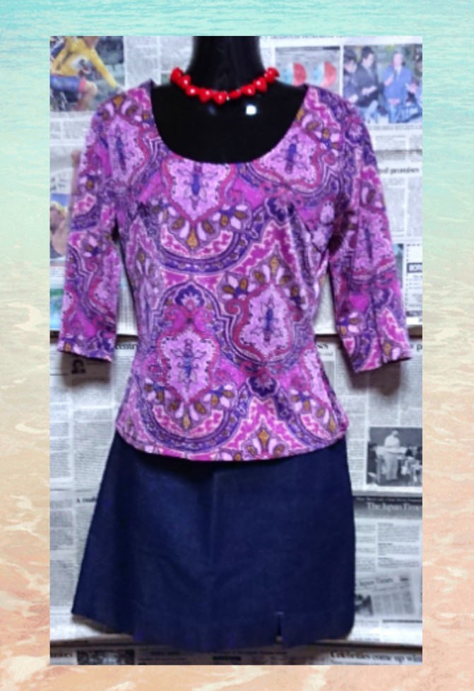 > 《未使用》【IMAGE サイケ 上下セット】カットソー スカート ミニスカート 伸縮性 トップス セットアップ ボヘミアン M 柄 五分袖 ラメ