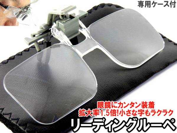 - いつものメガネにかんたん装着 両手が使えるクリップ式拡大鏡リーディングルーペ 1.5倍ワンタッチ跳ね上げ式遠近両用で使える眼鏡に