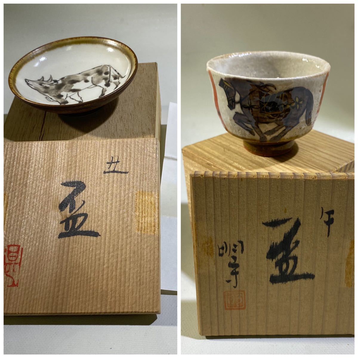 - 九谷焼 中田明守作 牛と馬干支盃 対 共箱 西とA